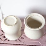 2 pots à sucre et café en grès clair moucheté vintage. La forme et la couleur en font de très belles pièces décoratives dans une cuisine ou dans toute autre pièce de la maison.
