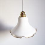2 suspensions avec un abat-jour en verre opaline blanc et liseré brun vintage. Le fil électrique est de couleur blanche.