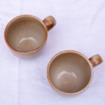 2 tasses et leur soucoupe en grès, provenant de la faïencerie de Sarreguemines.