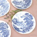Lot de 4 assiettes plates, par la faïencerie de Gien à décor bleu avec son pont, village et château.