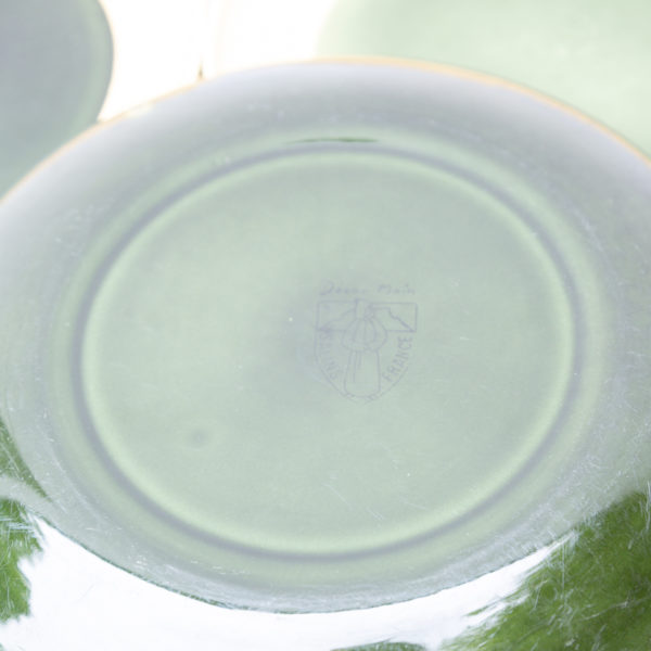 7 assiettes plates de couleur verte avec un large bandeau beige/jaune sur son pourtour. Le décor est fait main, la signature est apposée au dos de chaque assiette « décor main Salins France ». Il s’agit du modèle Capvern.