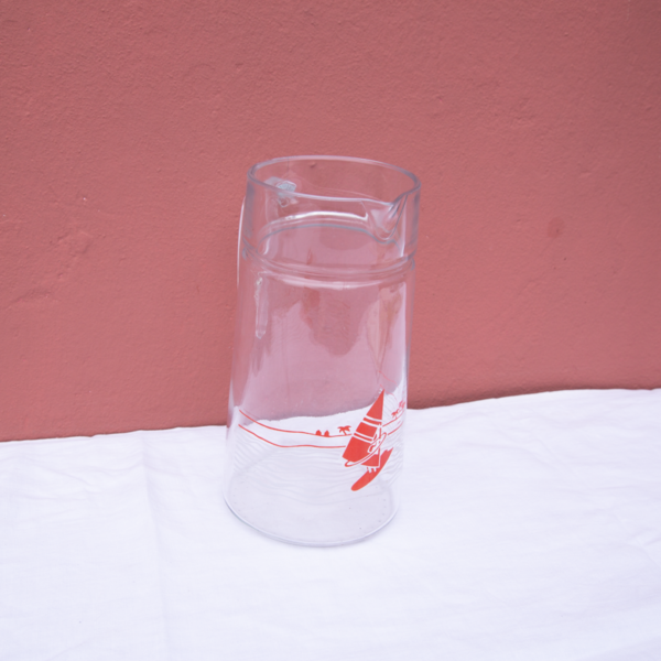 Carafe vintage au dessin rouge et blanc : planche à voile mer et palmiers à l’horizons.