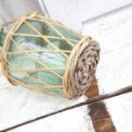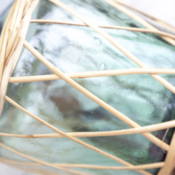 Dame jeanne en verre, de couleur plutôt bleue, en parfait état. Sa contenance est d’environ 2 L. Elle est accompagnée d’un habillage en osier.