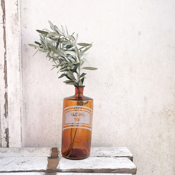 Ancien flacon de pharmacie alcool a 90° en verre, de couleur marron. Très bien conservé, aucun éclat. Idéal en décoration tel quel ou accompagné de fleurs fraiches ou séchées !