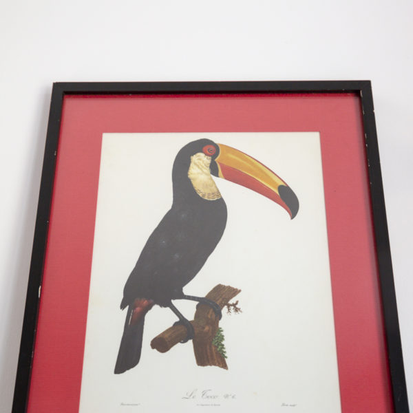 Gravure encadrée d’un toco, » Le Toco N°6″. Inscription également en bas de l’oeuvre « Barraband pt » et « imprimerie de Rousset ». L’oiseau est représenté perché sur une branche d’arbre.