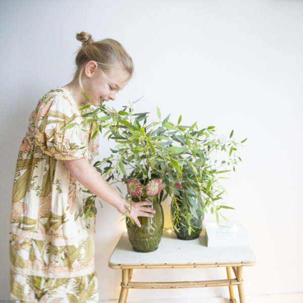 Vase en barbotine vert tirant sur le kaki à décor de fleur de type églantine. Il n’est pas signé, mais il appartient à une paire, le second quant à lui est numéroté 178 et signé sous sa base. Il s’agit probablement d’une faïencerie belge.