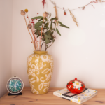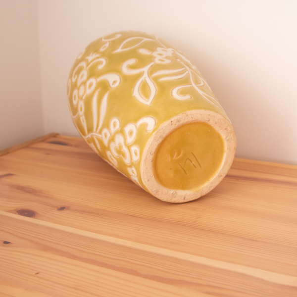 Vase jaune clair avec décor en émaux blanc. Le vase est signé avec une numérotation sous sa base (voir photos). Cependant la signature n’a pas été authentifiée.